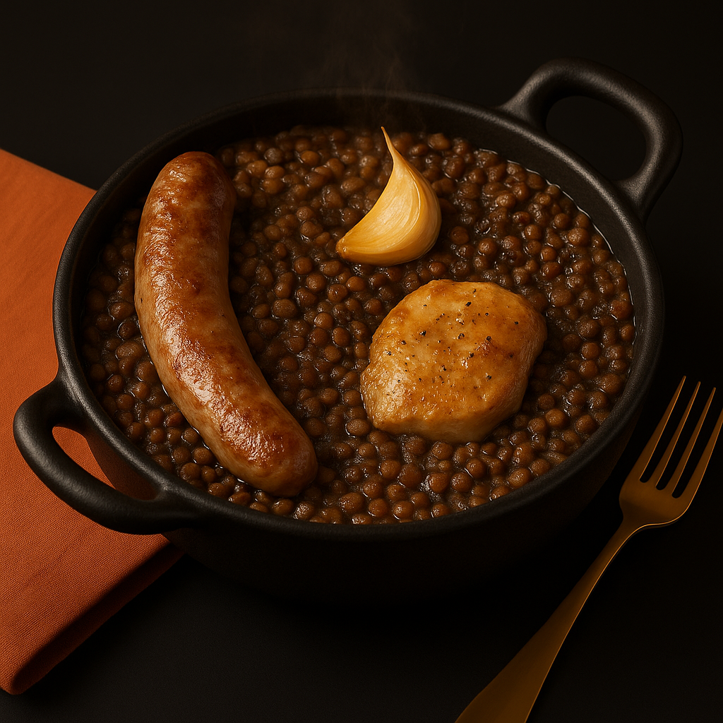 La douceur des lentilles, la générosité de la saucisse et la rondeur du bouillon forment un équilibre authentique et nourrissant.